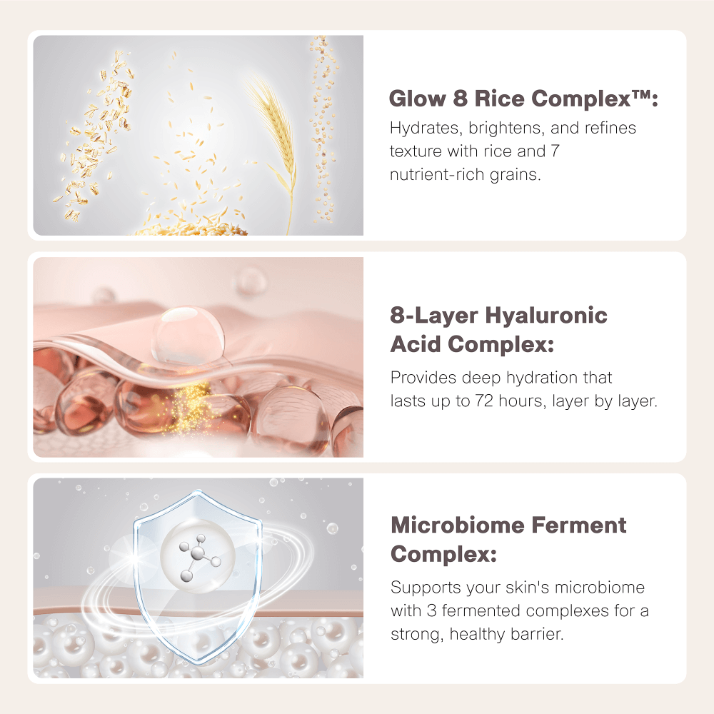 - Highlights the brightening and repair functions powered by rice extracts, niacinamide, and ferment ingredients.