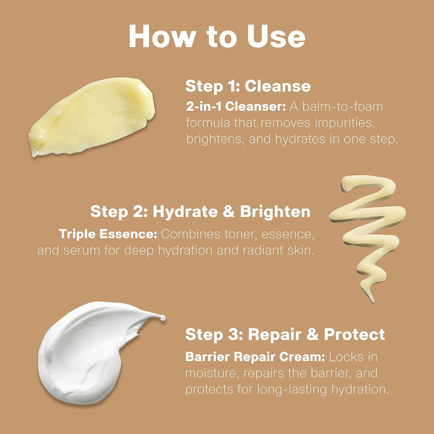 Step 2 (Hydrate & Brighten): Triple Essence: After cleansing, apply a small amount to clean skin using gentle patting motions. For dry skin, apply additional layers for an extra boost of hydration.