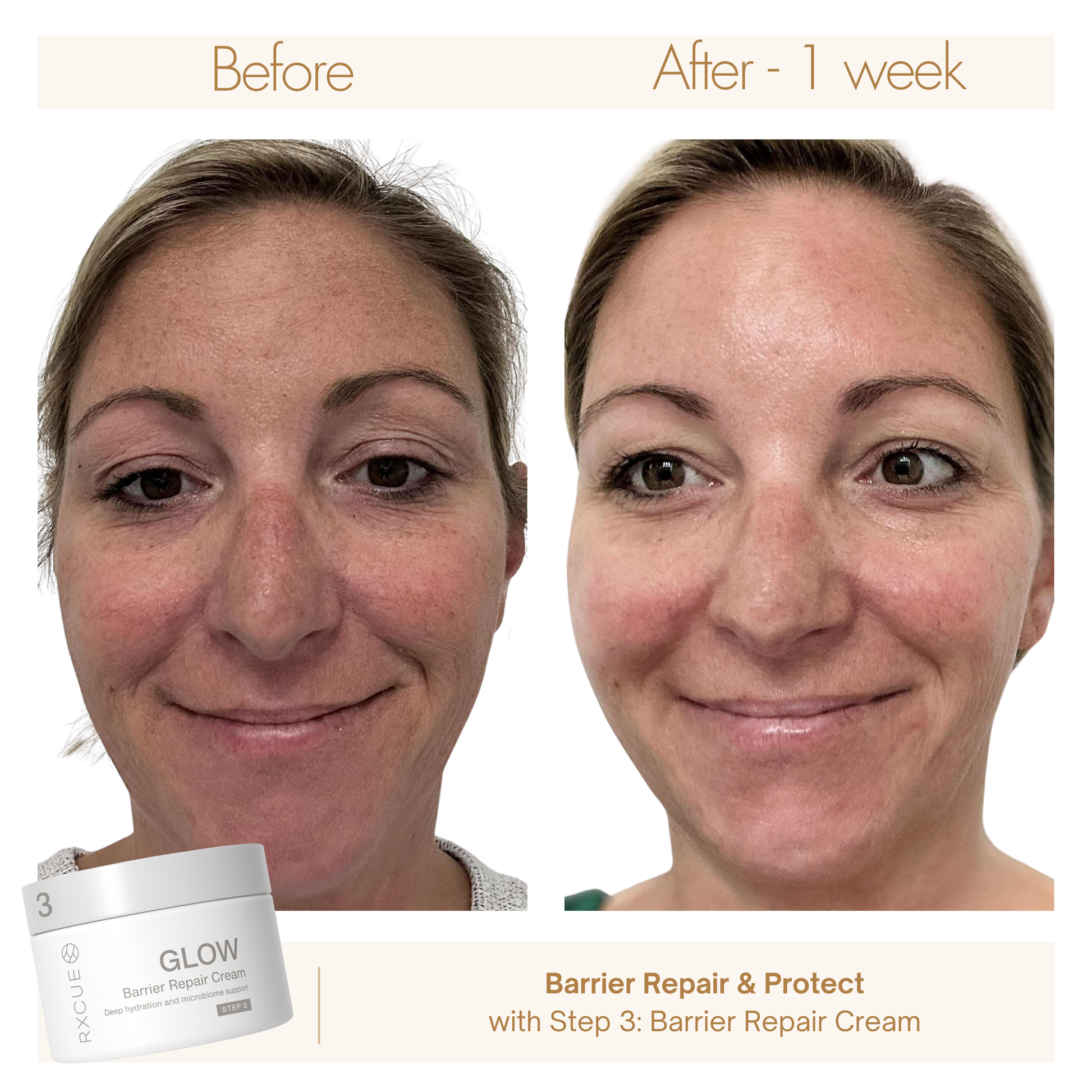 Step 3 (Repair & Protect): Barrier Repair Cream: Gently apply a small amount to your face and neck in the morning and evening. For an added boost, apply an extra layer as a sleeping mask at night.